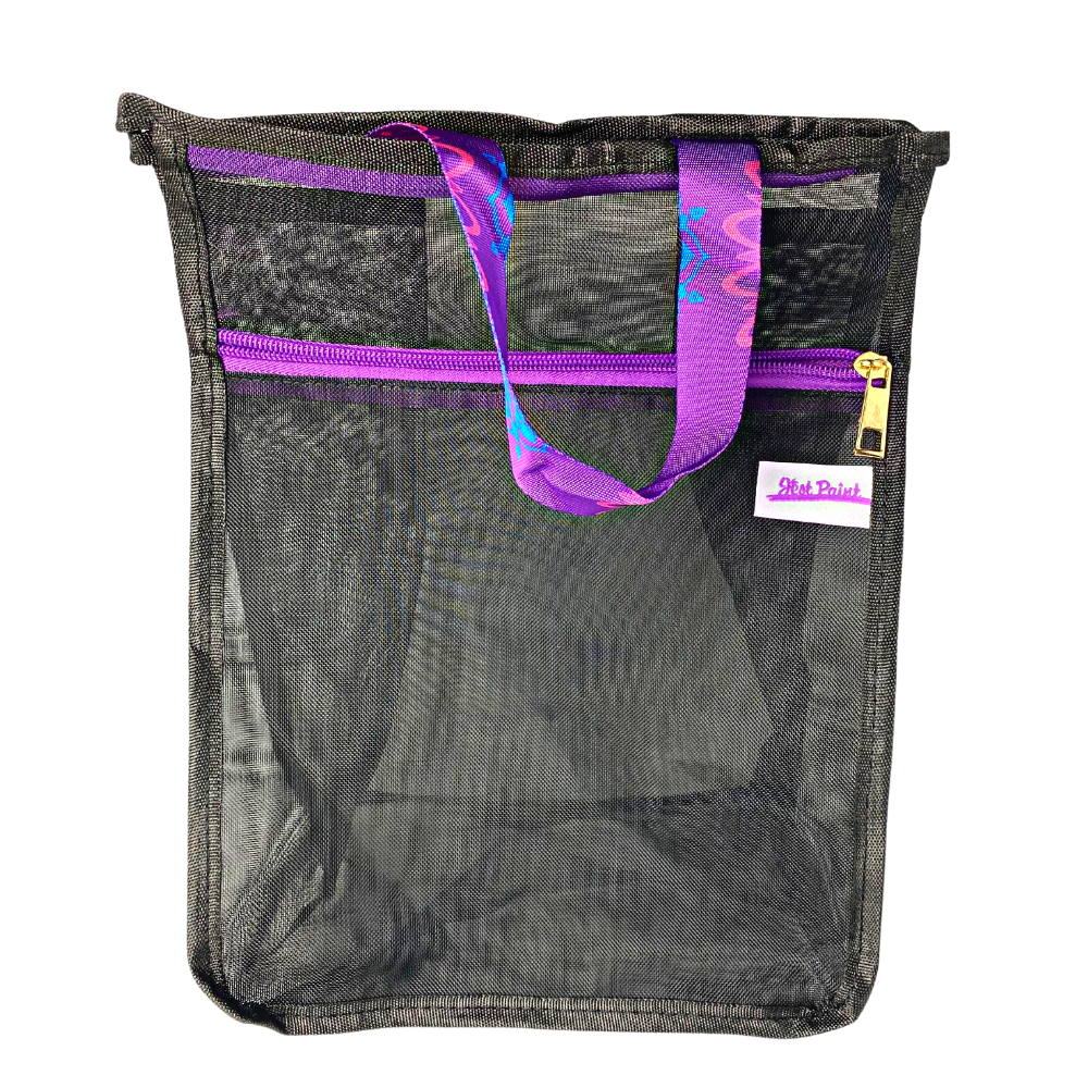 The bag is made from black polyester mesh that is breathable. It has a firm frame so it can stand on its own but also be folded when empty. The bag has one top purple zipper to access the main compartment where you can store your sponges, fitting around 75 half circle sponges (without compressing them). Then there is a front zipper that allows you to access a separate pouch, also made from mesh fabric, that reaches all the way to the bottom of your bag and expands to allow you to store around 25 more half circle sponges (without compressing them). The bag has a side loop to hang it from any hook and a long top handle that also allows you to hang it from any hook and keep the zipper open to reach into it to either pick new sponges or toss used ones. The top handle is made from a silky smooth fabric with a custom made pattern designed by Anna and Santi from Jest Paint. This durable and reusable mesh bag won't stain easily thanks to its black polyester material so don't be scared to use it!